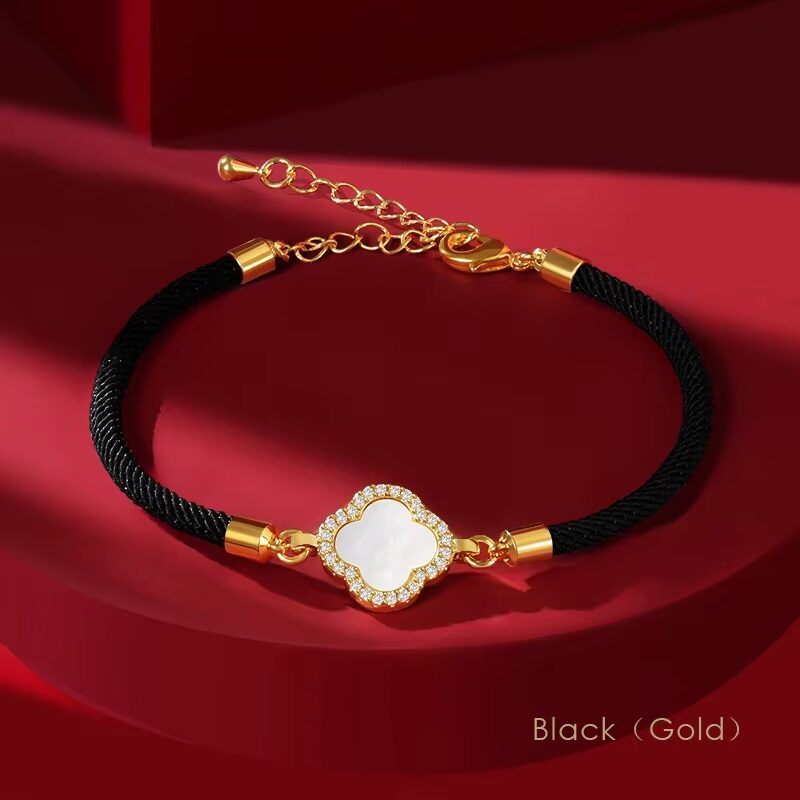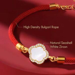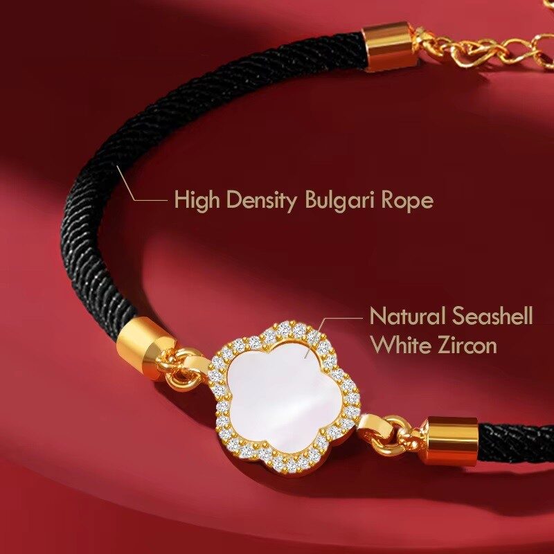 Adorn your wrist with this elegant talisman featuring a luminous natural seashell four-leaf clover, delicately framed by shimmering white zircons for a touch of refined sparkle. Expertly crafted with a high-density Bulgari rope and a secure gold-tone adjustable chain, this bracelet seamlessly blends luxury materials with a timeless symbol of luck. Available in classic midnight black or vibrant scarlet red, it is the perfect sophisticated accessory to elevate your daily style.