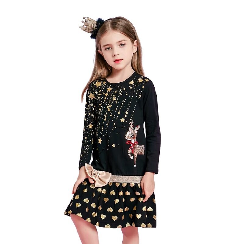An abundance of gold glitters beautiful detail to a special-occasion dress enhanced with festive Christmas Rudolph shimmer and finished with a satin ribbon.