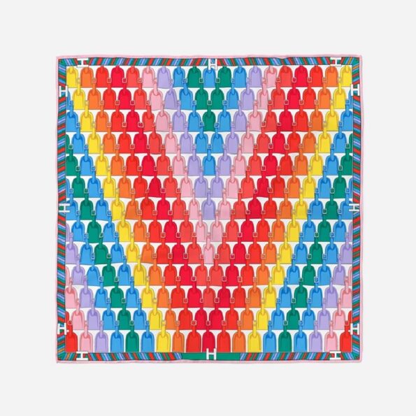 This luxurious soft silk scarf (53 cm) showcases a geometric pattern similar to a luggage tag, blending tradition with modern flair. Its refined details and vivid colorful rainbow tones make it a statement piece for both casual chic and polished looks. A must-have accessory for elevating everyday outfits with a touch of artistic sophistication.