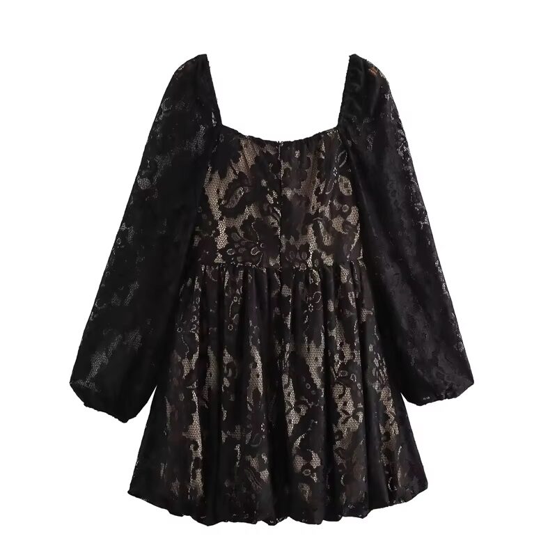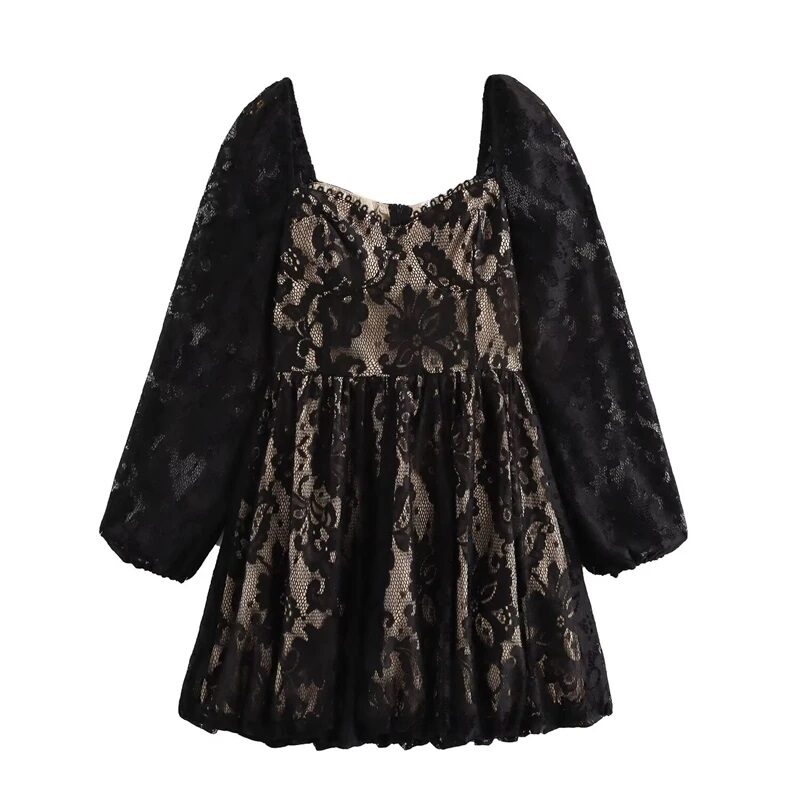 Introduce effortless style to your wardrobe with this black floral motif lace mini dress.