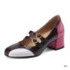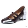 The design is elevated with striking metallic accents—a sleek silver toe cap and matching silver chunky heel option that adds a contemporary shine. Another variant showcases a bold pink heel, creating a playful contrast against the dark burgundy leather for a stylish statement.