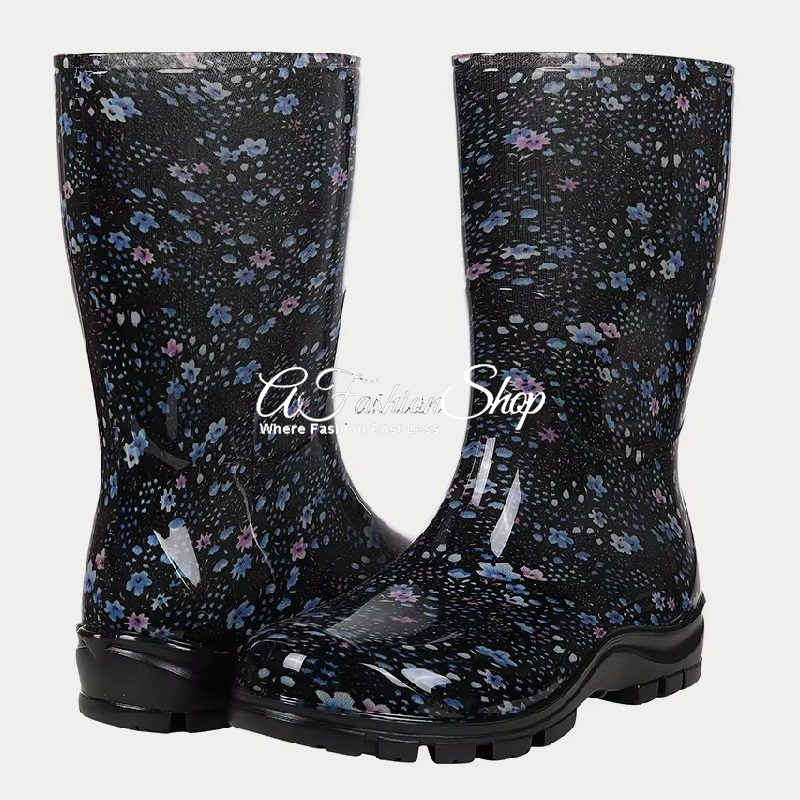 Designed to promote dry comfort on drizzly days in a fully waterproof rain boot grounded by a contoured, slip-resistant sole.