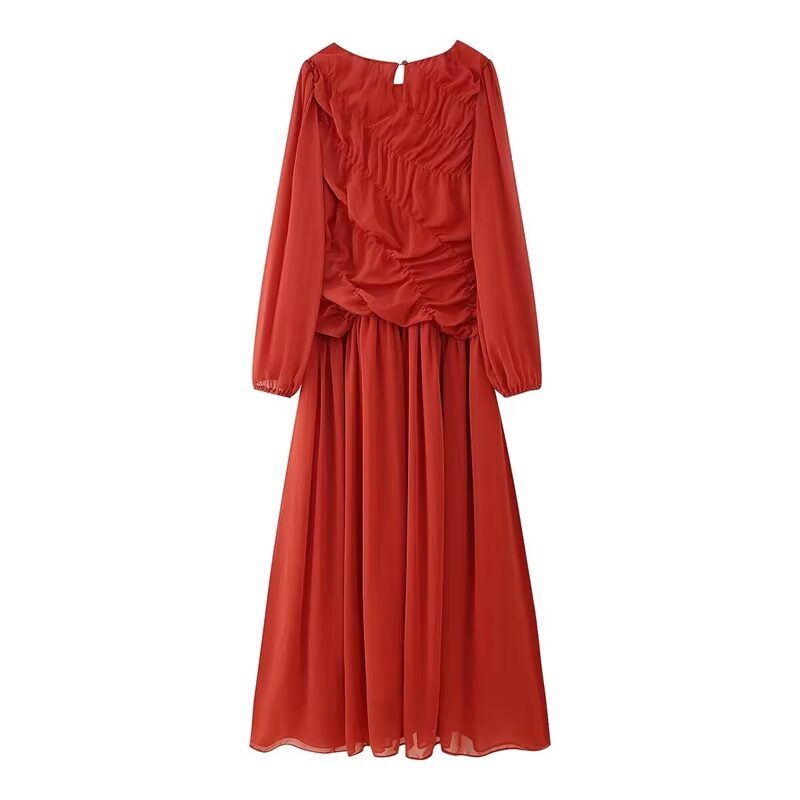 This elegant maxi dress is defined by its stunning movement and intricate detailing. Crafted in a vibrant terracotta (or rust) chiffon, it features a full-length, flowing A-line skirt that creates a beautiful, ethereal drape.
