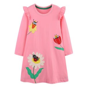 This short-sleeve dress is made from a soft, dark navy blue fabric decorated with whimsical unicorn appliqué on the front. The unicorn has a vibrant, rainbow-colored mane, a floral gold horn, and a simple embroidered face.